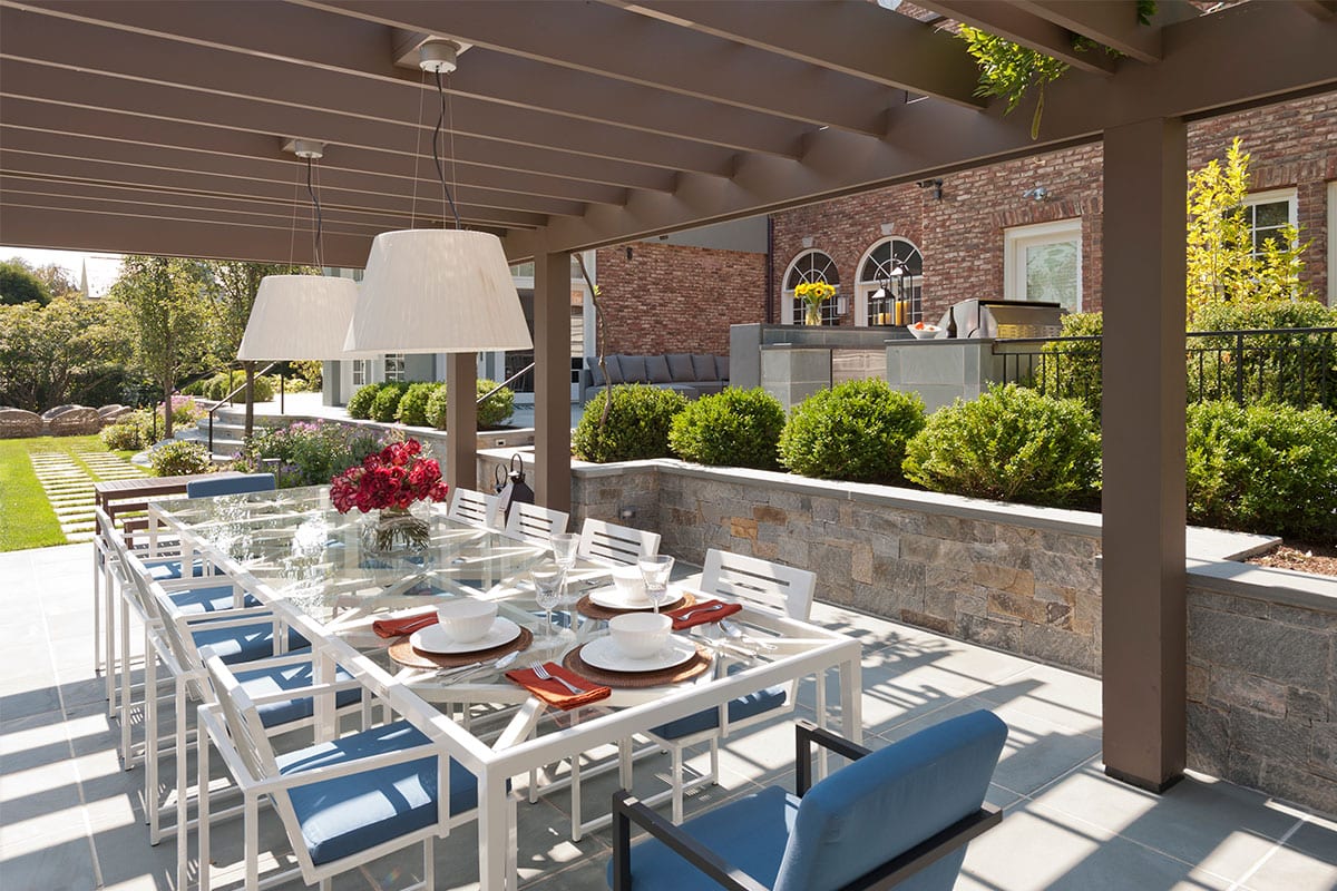 The outdoor entertaining spaces are divided into several entertaining areas, including the main terrace, outdoor dining terrace, pool terrace and a fire pit. One concern was not disrupting the neighbors with loud music. We made sure that the speaker heads were facing into the yard and strategically angled to get the best listening experience.