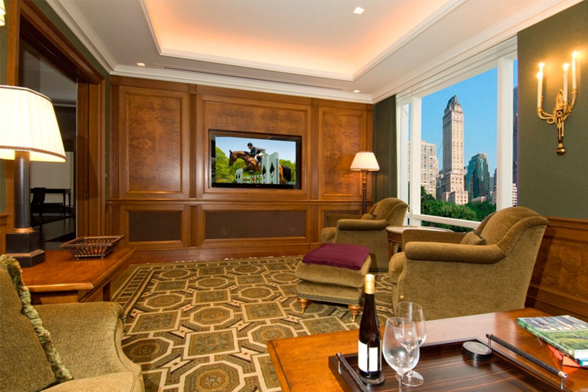 Our client wanted a state-of-the-art media room that disappeared into the décor of his new apartment and performed to a reference standard at all times of day. The objective: create an entertainment environment that blended seamlessly into the surrounding space. Functionality was also essential. The installation needed to have high visibility in all lighting environments, which proved to be quite a challenge because of the floor-to-ceiling windows and ceiling constraints of the client’s New York City penthouse apartment. It was also a challenge to install a projector in a ceiling constricted by concrete decking that forced a maximum height of the ceiling. There was little room for compromises, which made the project all the more gratifying in the end.