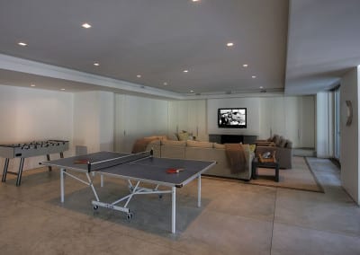 The main goal for this area was to create a multi-purpose room to suit the needs of the whole family. This space is primarily used for watching sports and movies, playing cards and billiards, and hosting casual parties. The project encompassed integration into an existing whole-house audio system, a home theater with surround sound and independent televisions over a bar area. We transformed the client’s walk-out basement into the ultimate fun room. The client, an ex-college football player, wanted a combination of an elegant sports bar, home theater and billiard room. He and his son enjoy watching sports on multiple high definition screens, while his daughter is partial to hosting movie nights with friends. Everyone in the family loves accessing music anywhere in the house.